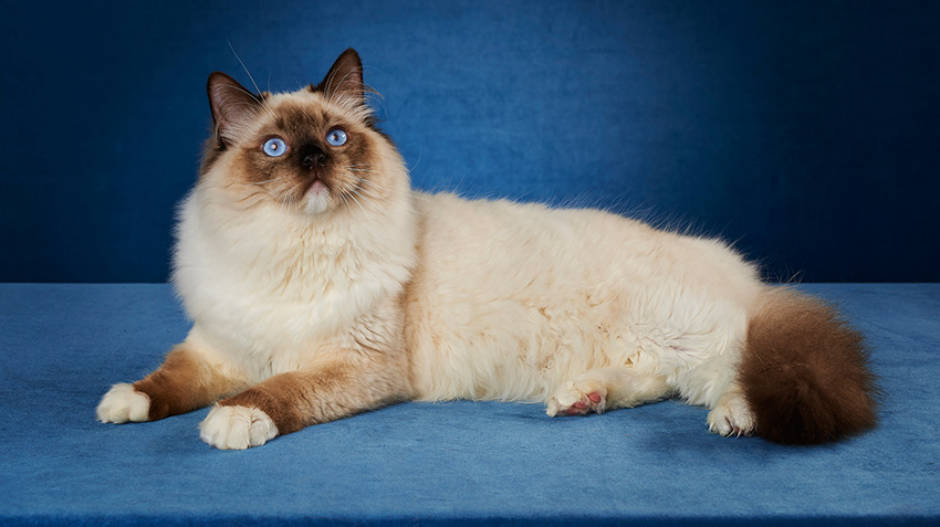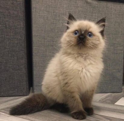 Ragdoll kittens have long bodies with large round paws. Their heads are broad and their eyes are large and expressive. Ragdolls have short legs, but they are strong and athletic. Their tails are long and thick, with tufts at the tips that resemble pompoms.